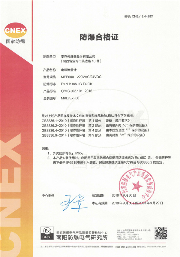 麥克傳感MFE600 220VAC/24VDC型電磁流量計(jì),通過國家防爆電氣產(chǎn)品質(zhì)量監(jiān)督檢查中心審查,取得防爆合格證。