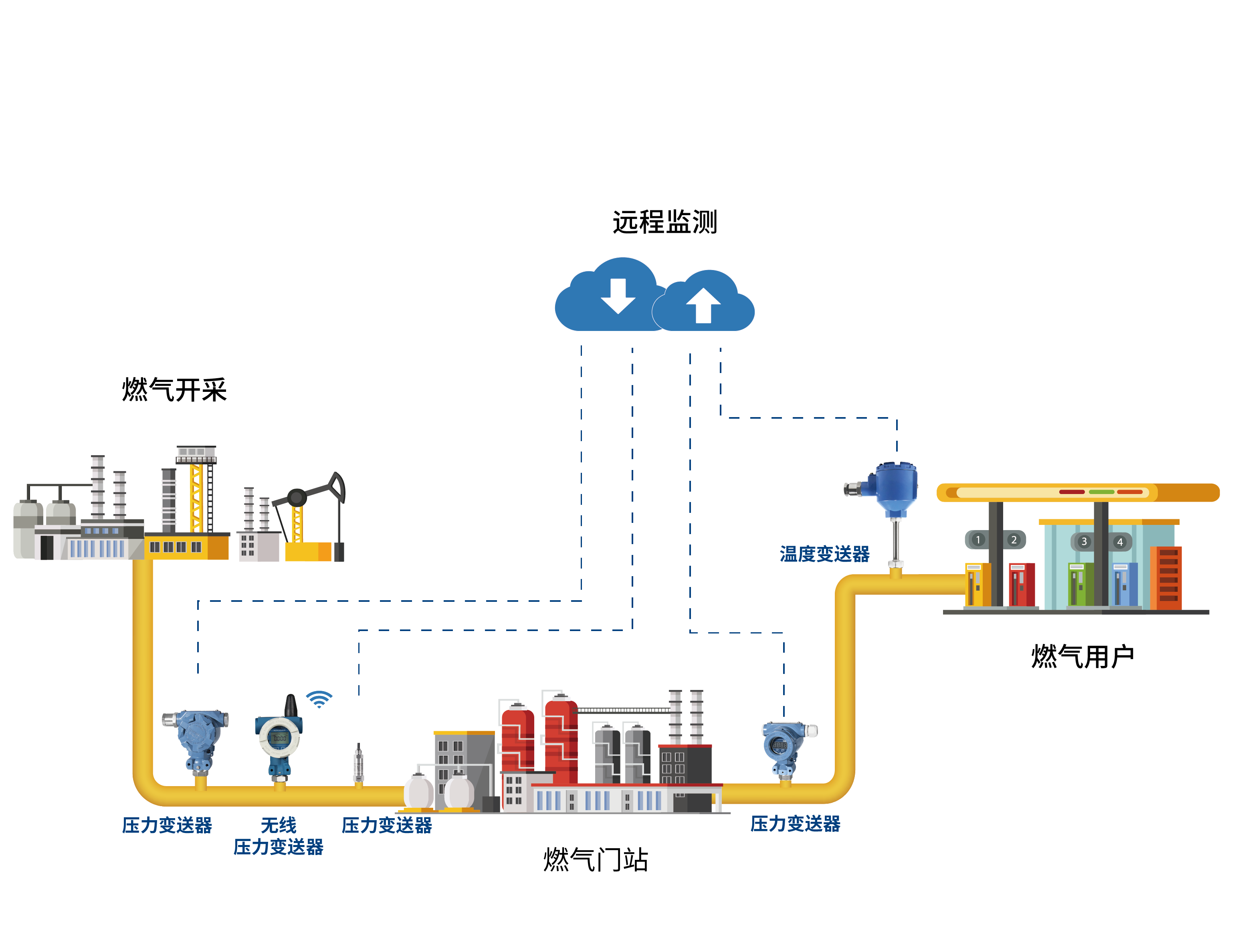 天然氣從開采到終端用戶使用,需要經過長的運輸管道輸送、過濾、除臭、調壓的過程,在這個過程中對管道中的壓力、溫度監(jiān)測,是保證系統(tǒng)正常運轉的關鍵所在。