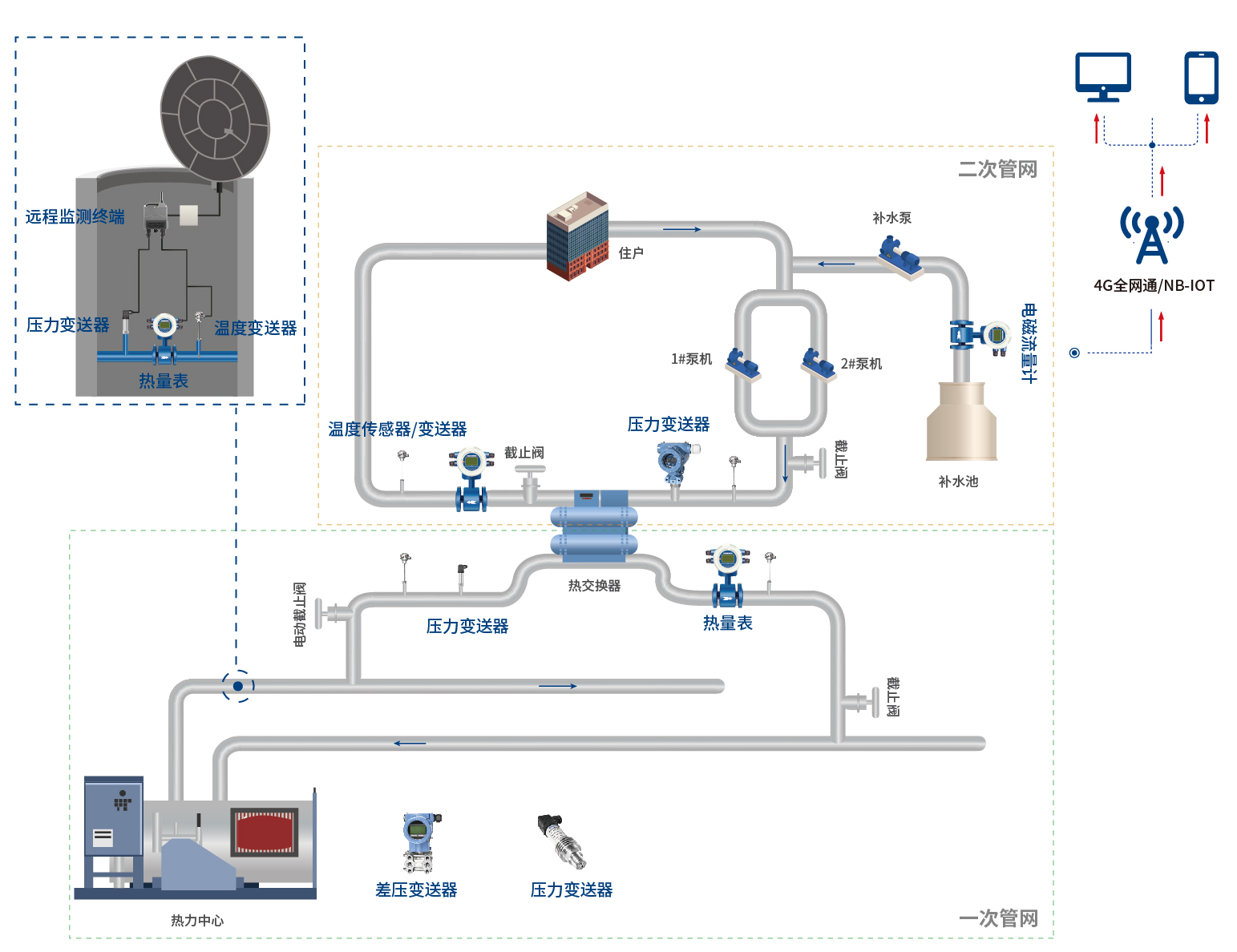 在換熱站供熱系統(tǒng)安裝電磁流量計(jì)、超聲波流量計(jì)、液位變送器、壓力變送器等設(shè)備,實(shí)時(shí)掌握供熱管道流量、熱量、溫度、壓力等數(shù)據(jù),保障供熱站正常運(yùn)行。